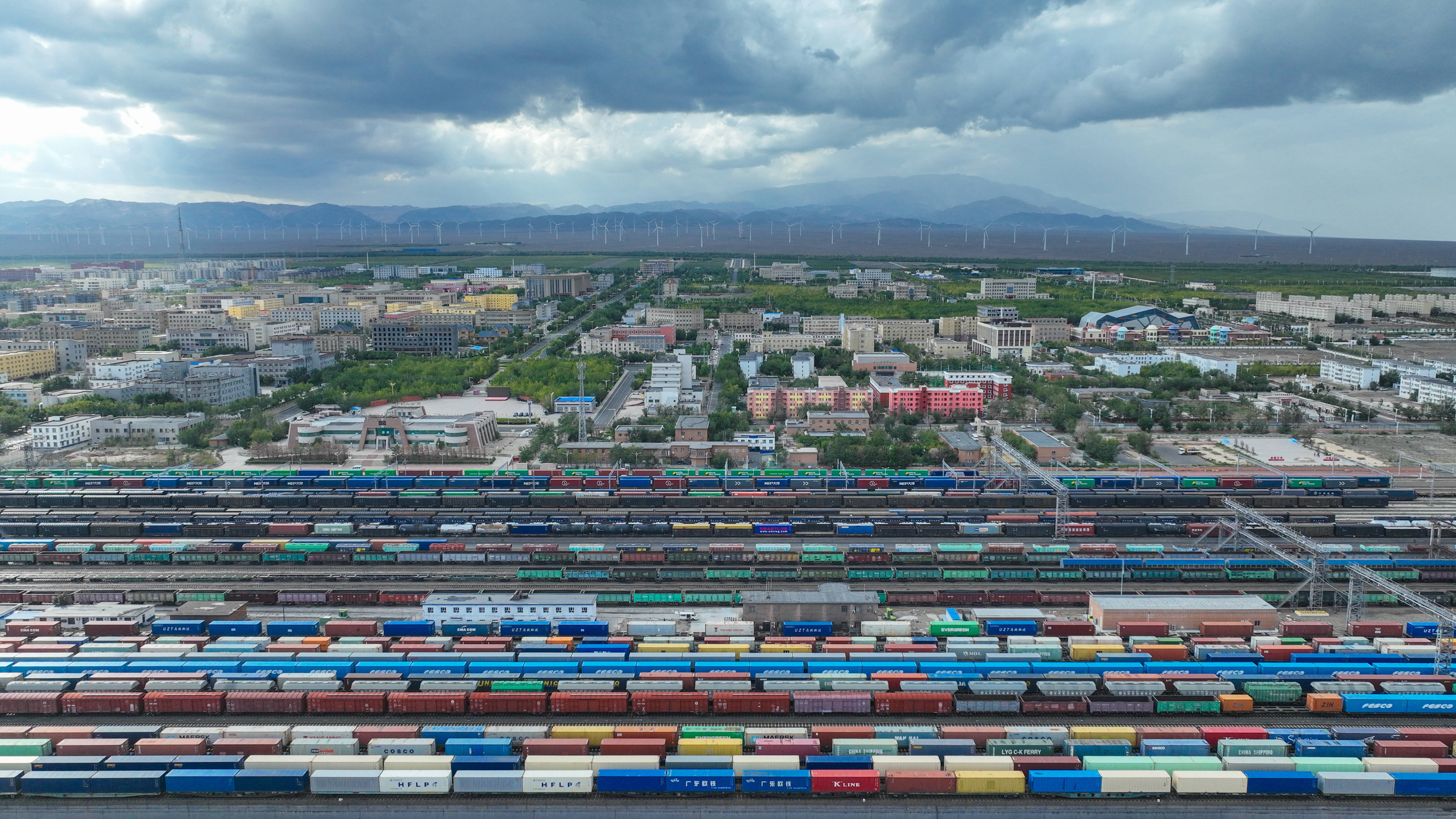 驰骋的中欧(中亚)班列与口岸风电机组。 尹甜杰 摄