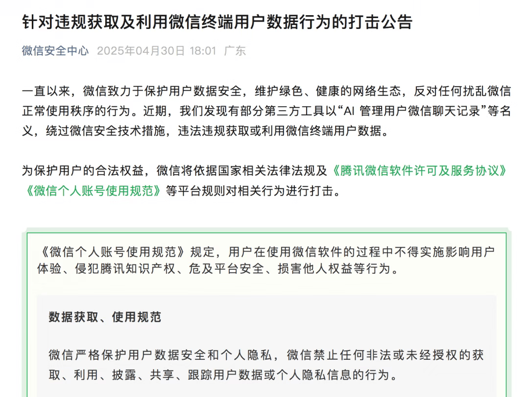 值得注意的是,今年4月,微信刚发布公告提醒用户切勿使用第三方工具管理微信聊天记录。此后,包括Siri、小爱同学、华为小艺等手机语音助手均无法再通过语音直接调用微信功能。