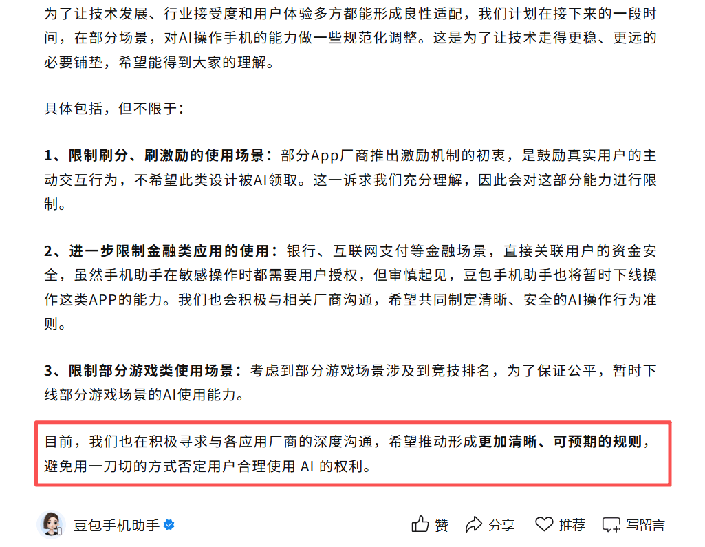 12月5日,豆包团队发布公告,称为了让技术发展与行业接受度良性适配,将对AI操作手机的能力进行“规范化调整”。其中包括限制金融类应用和部分游戏的使用。