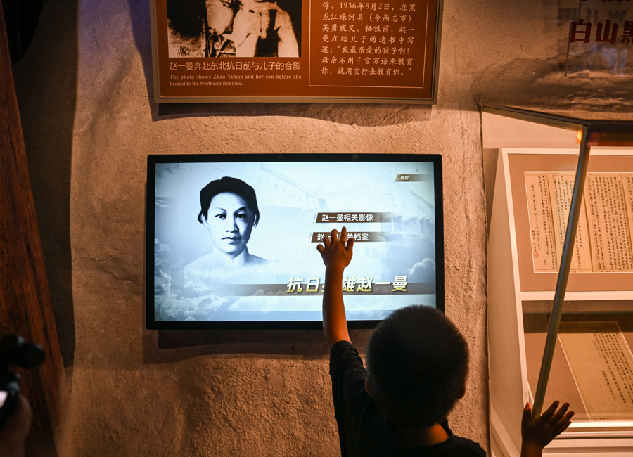 一位小朋友点击多媒体互动屏了解赵一曼烈士的相关事迹。