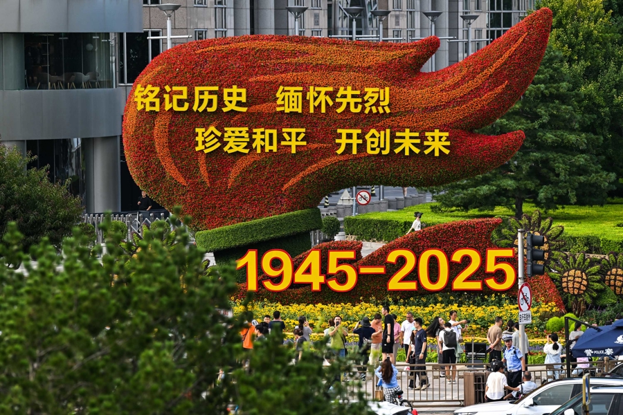 走在北京街头,纪念抗战胜利80周年标语横幅高高悬挂。长安街沿线,10组主题立体花坛再现抗战历史与和平愿景,营造出庄重热烈的纪念活动氛围。