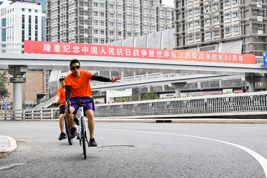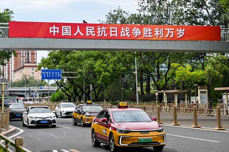 北京街头挂起纪念抗战胜利80周年标语横幅。