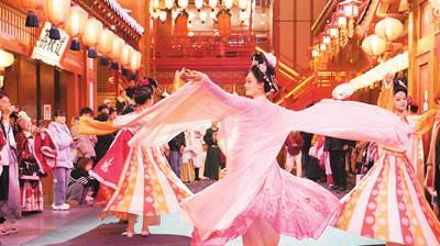 演员在陕西西安的长安十二时辰主题街区进行沉浸式表演。 新华社记者 邵 瑞摄
