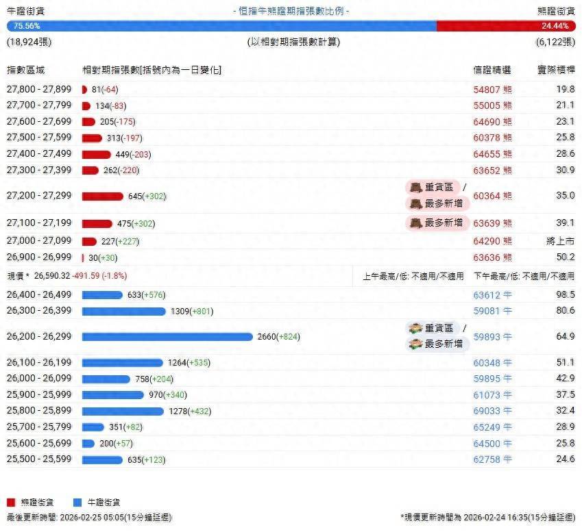 智通财经APP获悉,截至2月25日,恒指最新的牛熊街货比例为76:24。